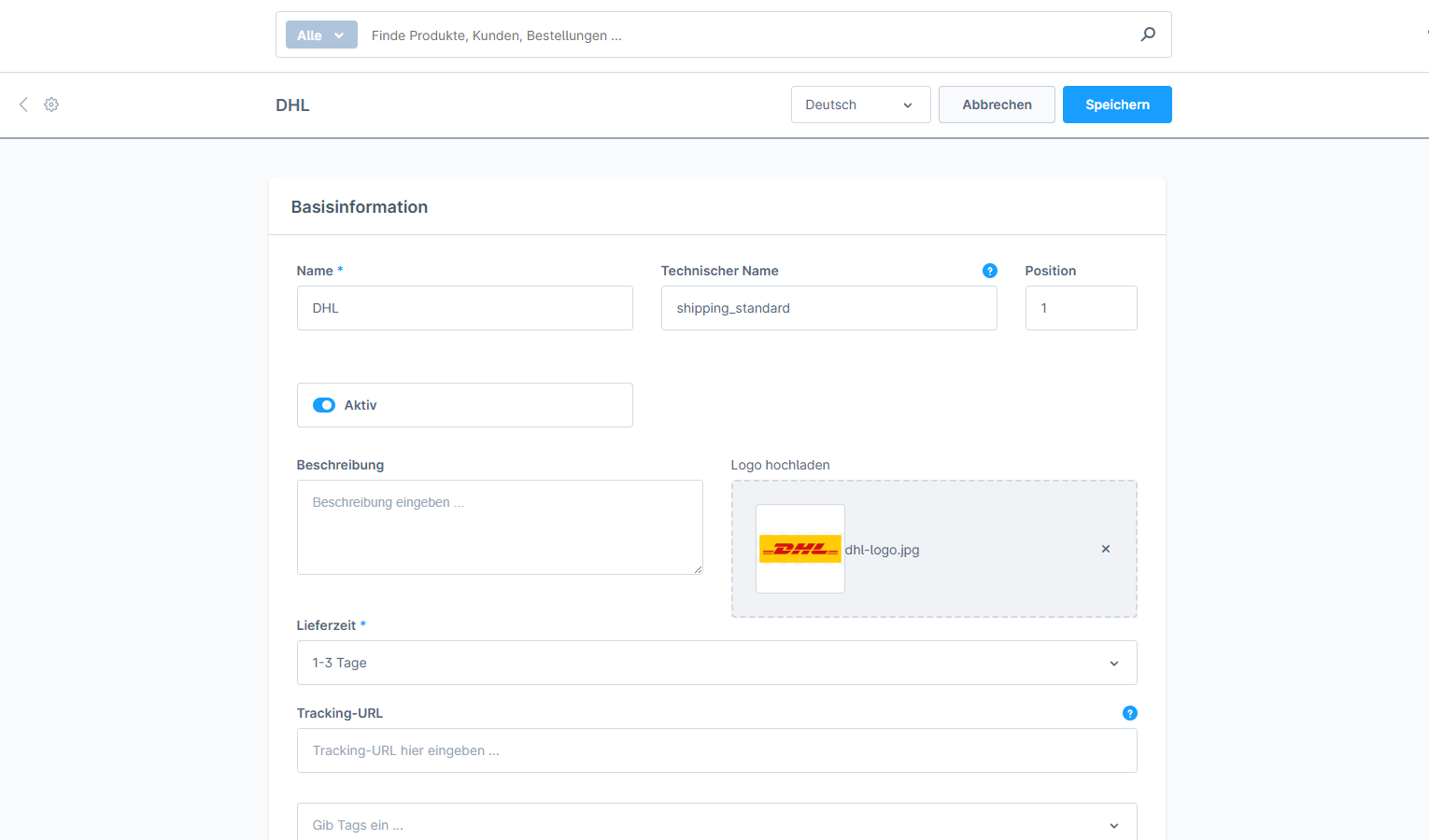 Solltest du eine andere Versandart benötigen, hast du die Möglichkeit unter Versand diese anzulegen und Lieferzeiten anzugeben, eine Beschreibung zu hinterlegen, ein Logo für die Versandart hochzuladen, die Tracking-URL einzutragen sowie Verfügbarkeitsregeln, Steuerberechnungen und eine Preismatrix zu hinterlegen.